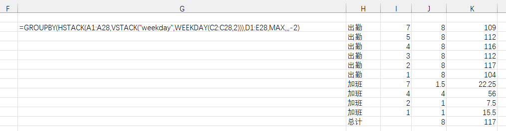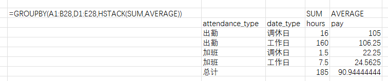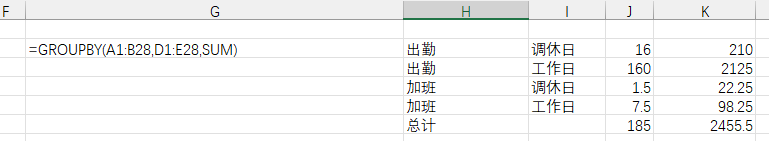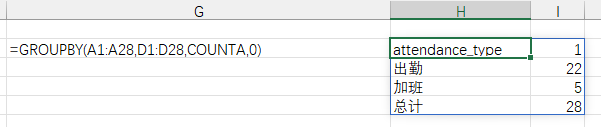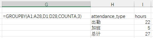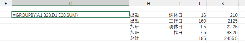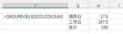 例如当在G2单元格输入=GROUPBY(B1:B28,D1:D28,SUM),row_fields参数为date_type的值,指按照date_type进行分组;values参数为hours的值,表示分组后对hours聚合;function参数为使用SUM说明对聚合的值进行的计算方式为求和。所以得到结果如下: