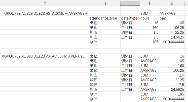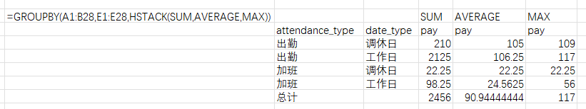attendance_type和date_type进行分组,计算每组中hours和pay的合计值,结果如下: