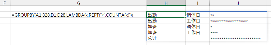 第二参数可以省略不写。当只有一个参数时,该参数表示分组后的值。例如公式=GROUPBY(A1:B28,D1:D28,LAMBDA(x,REPT("*",COUNTA(x)))),表示根据分组后的非空单元格个数显示多个”*“构成的字符串,如图: