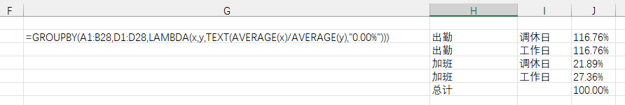 第二参数不忽略时,第一参数依然代表分组后的值,第二参数代表groupby中第二参数(values)对应列的值。例如公式=GROUPBY(A1:B28,D1:D28,LAMBDA(x,y,TEXT(AVERAGE(x)/AVERAGE(y),"0.00%"))),表示组内平均值与全列平均的比值,如图: