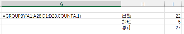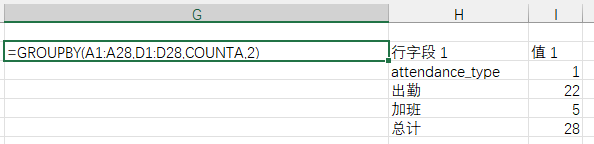 row_fields、values的数据不含标题,但是会在分组后自动生成标题。例如公式=GROUPBY(A1:A28,D1:D28,COUNTA,2),由于field_headers值为2,所以第一行数据被进行分组操作后出现在结果数据中,同时系统将自动生成标题,所以有下面的结果
