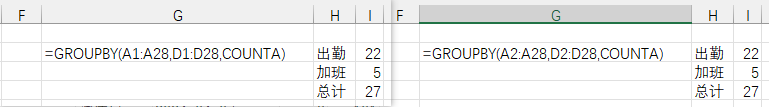 特别的,当该参数未指定值时,系统会默认不显示标题,并自动检查前面第二参数values中第一行值类型与第二行是否相同来判断第一行数据是否为标题从而得出要进行分组的数据。所以公式=GROUPBY(A1:A28,D1:D28,COUNTA)与=GROUPBY(A2:A28,D2:D28,COUNTA)得结果一致,如下图: