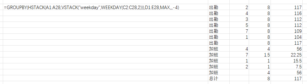 上面公式与=GROUPBY(HSTACK(A1:A28,VSTACK("weekday",WEEKDAY(C2:C28,2))),D1:E28,MAX,,,{1,-2})以及=GROUPBY(HSTACK(A1:A28,VSTACK("weekday",WEEKDAY(C2:C28,2))),D1:E28,MAX,,,{-2,1})等价,因为分组列排序顺序:左起第一列>左起第二列>…,如下图