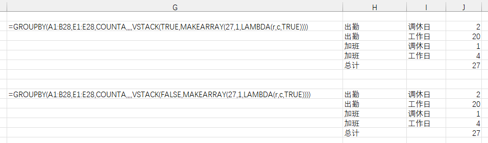 第七参数filter_array用于对数据在分组前进行筛选,其参数值为与第一、第二参数行等长的布尔数组。需要注意的是如果前面已经确认(不论是否显式)第一二参数中第一行为标题,则filter_array值的第一行数据无效,也就是公式=GROUPBY(A1:B28,E1:E28,COUNTA,,,,VSTACK(TRUE,MAKEARRAY(27,1,LAMBDA(r,c,TRUE))))与=GROUPBY(A1:B28,E1:E28,COUNTA,,,,VSTACK(FALSE,MAKEARRAY(27,1,LAMBDA(r,c,TRUE))))结果相同,,结果如下图