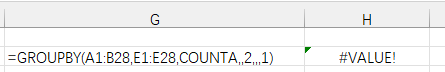 当第八参数field_relationship的值设置为1时,无法进行小计,例如公式=GROUPBY(A1:B28,E1:E28,COUNTA,,2,,,1)将提示错误,如图