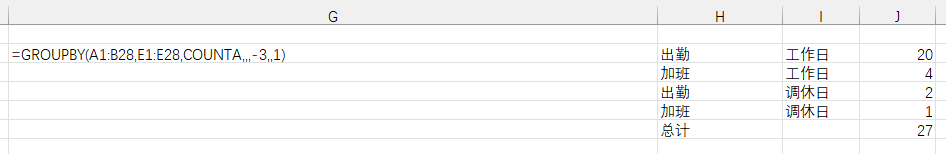 排序时不在份组内与组间排序,将直接针对结果数据进行排序。例如公式=GROUPBY(A1:B28,E1:E28,COUNTA,,,-3,,1)按照第三列降序排列时,将不再先获取”加班”和”出勤”的最大值进行组间排序而后再组内排序,而是会按照第三列每一行的值直接降序排列,如下图