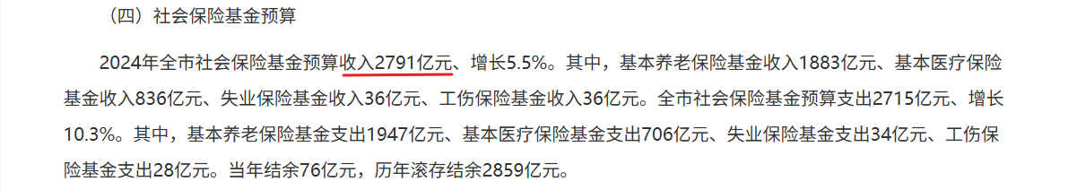 基本养老保险基金收入1883亿元、基本医疗保险基金收入836亿元、失业保险基金收入36亿元、工伤保险基金收入36亿元