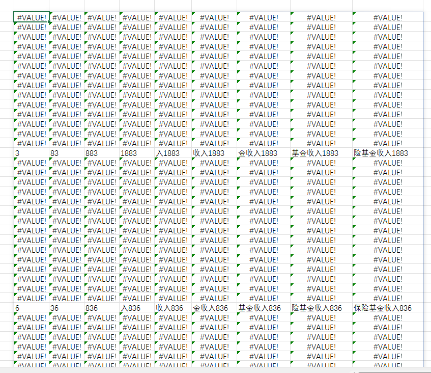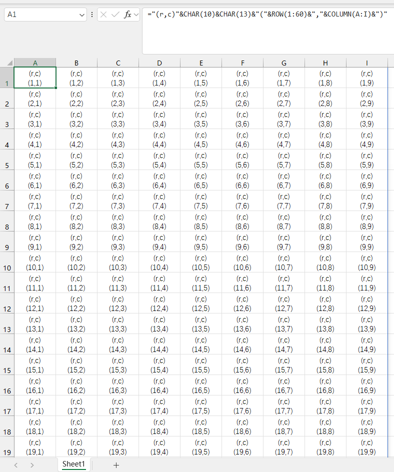 需要注意的是这个公式只能提取以特定字符结尾的数字。公式中用到了几个我不熟悉的知识点。第一个是text()第二参为空可以将纯数字构成的字符串置空。第二个是矩阵,row(1:60)或生成1~60的一列数据,column(a:i)或生成1~60的一行数据,当对它们进行运算时会生成$60×9$的矩阵。
